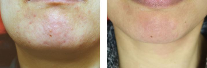 「大人ニキビ」が出やすいといわれるアゴ。使用開始時点(左)は吹き出物がひどく、痛みを感じるほど。ピュア水素水スチーマーを使用して約1か月経過後(右)、まだ肌荒れはあるものの、大きな吹き出物は姿を消しました