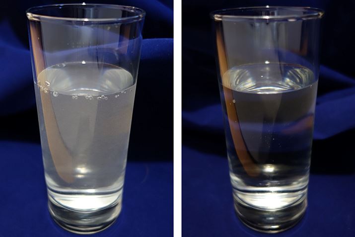 出来あがった水素水をコップに入れたところ。生成後すぐは水素の細かな気泡で白濁して見えますが、2〜3分ほどでほぼ透明に