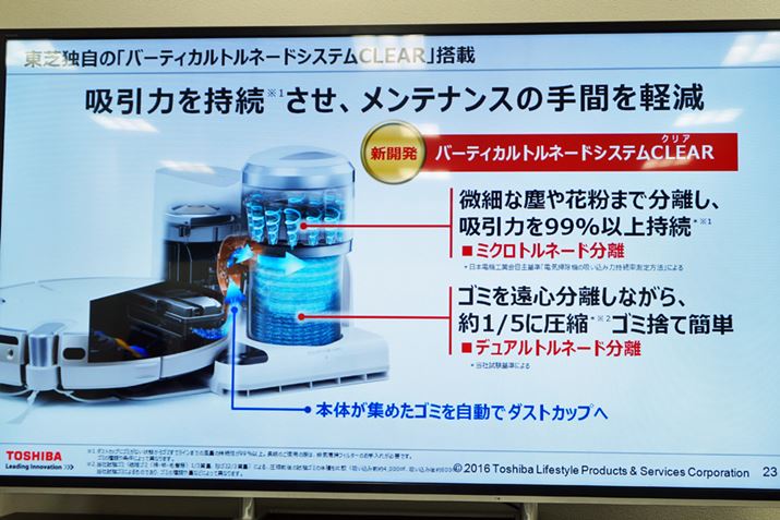 家事の負担を軽減できることから人気の高いロボット掃除機だが、すべてをおまかせにはできない。床のゴミはロボット掃除機が取ってくれるが、溜まったゴミを捨てるのは人の役目となる。その手間を減らそうと2014年に発売されたのが、東芝「TORNEO ROBO(トルネオ ロボ)」だ。集めてきた本体のゴミを充電台にあるダストカップに取り込む「ダストステーション」を備えており、約1か月間ゴミ捨て不要を実現。そんな「トルネオ ロボ」に、新モデル「VC-RVS2」が誕生した。ダストステーションの構造が一新されたほか、隅の掃除にも強くなったという。セミナーで見てきた仕組みを解説する。
