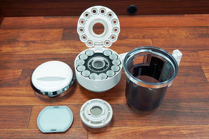 ダストカップの中で大きなゴミが遠心分離され、その後、上にある複数の小さな筒で細かいゴミを分離。キレイな空気だけが排気されるという。また、ダストカップに溜まるゴミは遠心力で約1/5に圧縮される