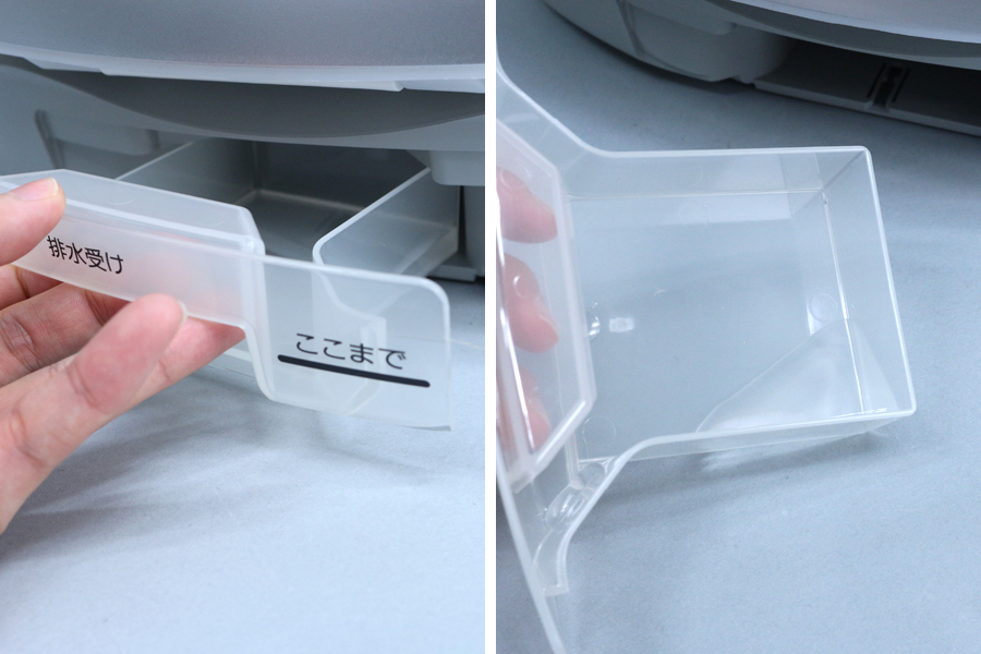 排出された水は本体下部の排水受けに溜まります。排水の量は10ml程度(写真右)