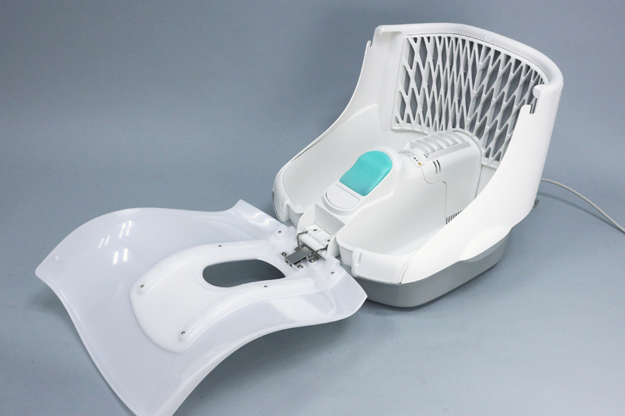 フタが180°開くので、足の出し入れや手入れが楽。スチーム噴出口はかかとの内側に、遠赤外線ヒーターはふくらはぎの裏側に配置されており、底には足裏板(取り外し可)を敷いて使用します