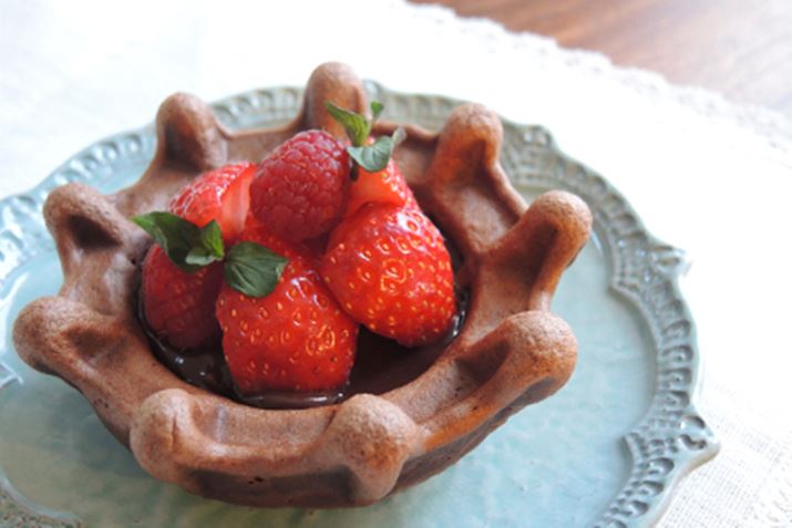 今回はレコルト「ワッフルボウルメーカー RWB-1」を使って、チョコレートのスイーツを作ります。ホットケーキミックスとココアで作る簡単なワッフルボウルにチョコクリームを詰め、イチゴやラズベリーを飾るだけ。オーブン無しで気軽に作れるデザートですが、華やかでおもてなしにもぴったり。バレンタインデーも近いのでぜひ作ってみてくださいね。