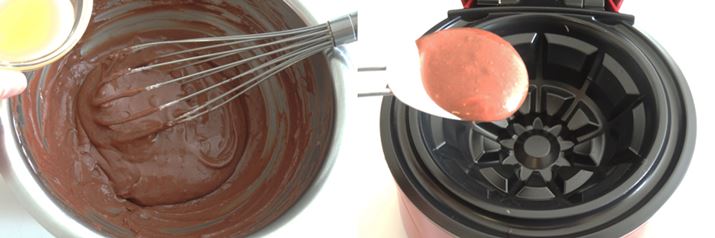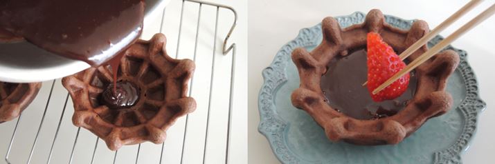 (9)あら熱をとったワッフルボウルにチョコクリームを1/4量ずつ注ぎ入れます。