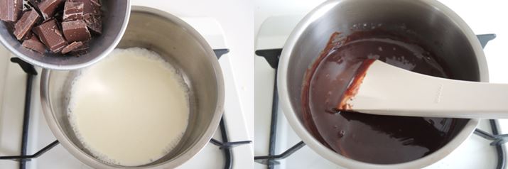 (7)すべて焼き上がったらチョコクリームを作りましょう。生クリームを沸騰直前まで沸かして火を止め、割ったチョコレートを入れます。