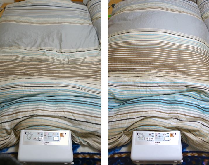 使用前、使用後の布団の厚みを比較。使用後は布団の厚みが2倍ほどになり、フカフカの感触に
