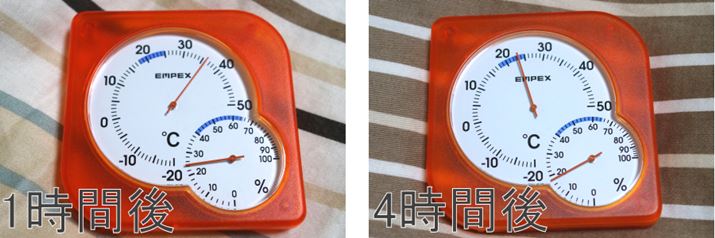 RF-AB20の「乾燥・標準コース」使用後1時間後と4時間後の湿温計。もともと40%あった湿度が、4時間後は20%以下に