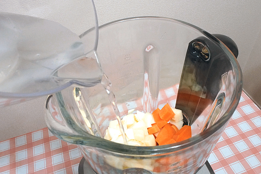 野菜3種類と水を容器に投入。ジャガイモや玉ねぎは1〜1.5cm角にカットしないといけなかったようでちょっと大きすぎましたが、結果的には問題ありませんでした(笑)