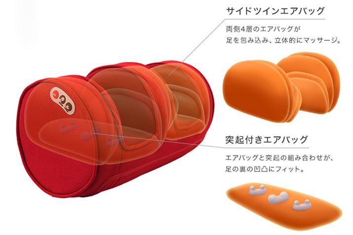 足の両側左右に各4層、計16層のエアバッグと、両足下に1つずつ計2個の突起付きエアバッグを配置