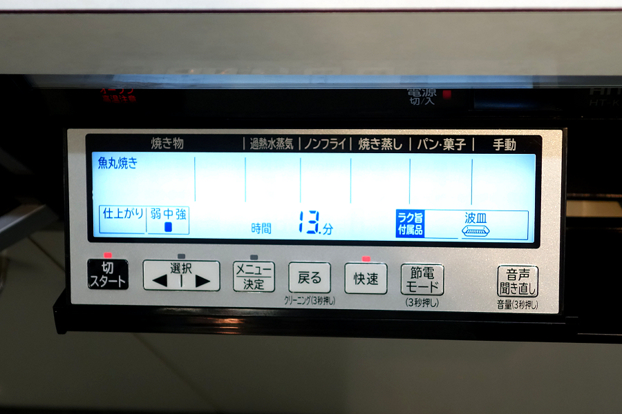 もちろん清掃がラクなだけでなく、味にもこだわっている。HT-K300XTWFは、グリルのヒーターにIHではなく、シーズヒーターを採用。シーズヒーターは加熱時に放出される遠赤外線と近赤外線の割合が8:2と炭火に近く、焼き魚やハンバーグなどが炭火で焼いたようにこんがり焼きあがるとのこと。また、上下のヒーターを切り替えながら加熱することで、さらに「炭火焼の魚に近い」焼き方ができるという。ちなみに、この方法でサンマを焼くと、焼き上がりに20分以上かかるのだが、「快速」ボタンを押すことで13分ほどで焼くスピードコースも選択できる。シチュエーションに合わせて「味」と「スピード」を選択できるのはうれしいポイントだ。