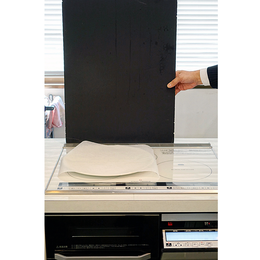 煙が上がりやすい焼き上がり寸前に、排気部に黒いボードをあてたところ。煙はまったく見えない