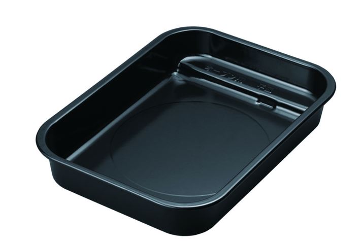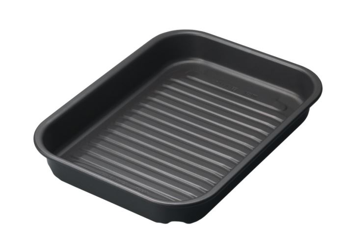 フチが約4.1cmある「ラク旨グリル」。グリル皿は大きめのサンマが5尾入るサイズだが、重さが約530gと一般的なグリル用の皿よりも軽量で、洗浄時にストレスになりにくい