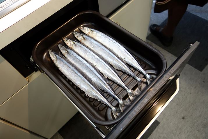 また、驚いたのが脱煙機能を搭載することにより、煙や匂いがほぼカットされていること。サンマは魚のなかでも煙と匂いが出やすいが、グリルの排気口に手をかざすと熱い空気は排出されているにもかかわらず、煙やにおいはほとんど感じられなかった。ちなみに、脱煙機能は「パラジウム酸化触媒」によるもの。触媒の力で脱煙するため、フィルター交換などの必要がないという。