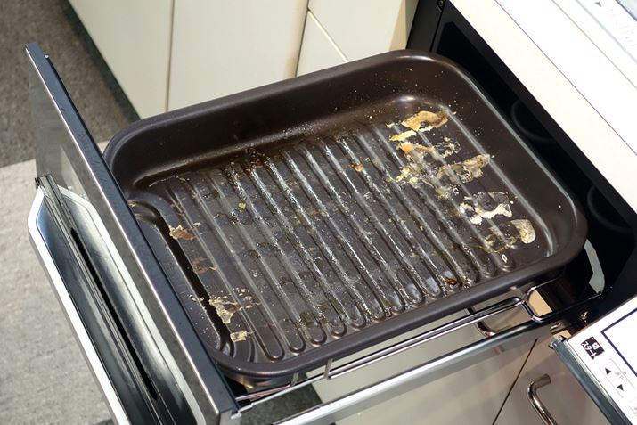 日立の調査によると、コンロ購入時に重要視する最大のポイントは「グリルの清掃性」。従来の魚焼きグリルは、「水を入れる受け皿」「焼き網」を洗う必要があった。さらに、サンマなどの脂の多い魚を焼くと、庫内全体が脂まみれになり、掃除をサボるとグリル全体が魚臭くなる。