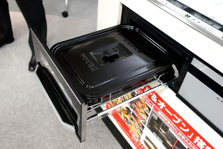 HT-K300XTWFは、グリル部で80〜280℃までのオーブン調理ができるのも特徴。ただし、グリル皿に使用している「フッ素加工」は250℃以上の熱に弱い。このため、オーブン使用時はホーロー製の「ラク旨オーブン」と呼ばれる平皿を使用する。グリル皿をオーブンで使用するという失敗を防ぐため、オーブン時にラク旨グリル皿を使用した場合は、センサーで感知。音声で注意を促すという機能も搭載している。