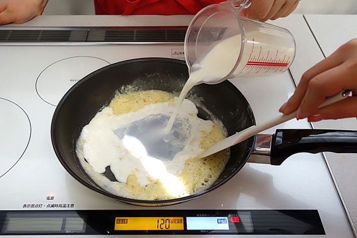 説明会では、一般的に「失敗が多い」といわれるホワイトソースを調理。温度を120℃に設定して鍋にバターを投入後、5分近くスタッフによる「適温調理」についての説明があったが、通常なら2〜3分で焦げてしまうバターがまったく焦げることなく調理されていた。また、IHごとに光センサーを搭載し、鍋の温度を管理。このため、途中で冷たい牛乳を入れると一気に鍋を加熱し、もとの120℃をキープしていた。