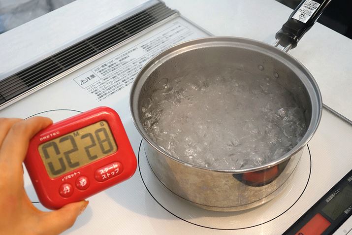 IHクッキングヒーターでは2分半弱で1lの水が沸騰。350ml程度の水ならば、約1分5秒で沸騰するという