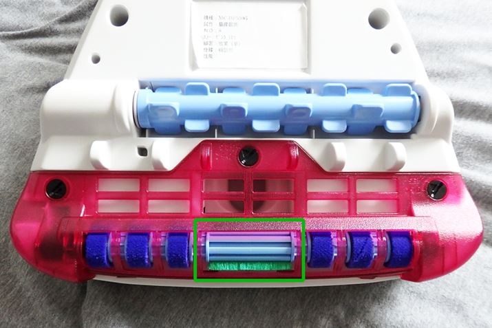 前方中央にある「ビートブラシ」(緑色の囲み部分)が毎分6,000回振動することで、布団の中のホコリを叩き出す。ビートブラシと連なっている青いブラシはモーター式となっており、走行をサポート。ただし、安全性を配慮し、電源をONにしただけでは回転しないようになっている。本体を動かすと(水色のローラーが回転すると)、青いブラシが回転する仕様だ