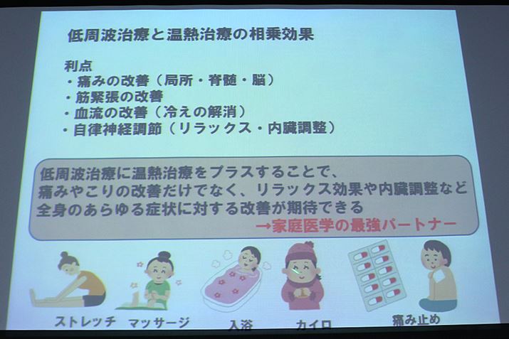 HV-F320には約41℃の温熱と低周波を交互に繰り返す「温治療コース」と、低周波の刺激のみで治療する「低周波コース」の2種類を搭載。発売に先立って行われた製品発表会では、明治国際医療大学鍼灸学部教授 伊藤和憲氏が「患部を温めることでリラックス効果のほか、血行をよくしてコリの緩和や筋肉の疲労回復を早める作用などが期待できる」と、低周波治療と温熱治療を組み合わせることのメリットを語りました。