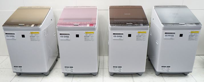 ラインアップされるのは3機種で、右から洗濯・脱水10kg/乾燥5kg「ES-PX10A」(市場想定価格:20万円)、洗濯・脱水9kg/乾燥4.5kg「ES-GX9A」(市場想定価格:17万円)、洗濯・脱水8kg/乾燥4.5kg「ES-GX8A」(市場想定価格:16万円)。いずれも、2016年6月23日発売予定となっている