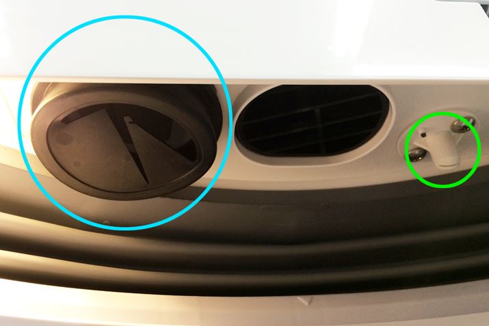 通常の給水口(水色の囲み)とは別に、シャワーが出る口(緑色の囲み)が用意されている。ちなみに、真ん中にあるのは乾燥時などに温風が出る部分