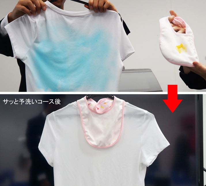 説明会では汗を模した液体を噴きかけたTシャツと、食べこぼしで汚れた前掛けをサッと予洗いコースで洗う実演が行われた。約5分後、どちらも汚れは視認できないレベルに! この程度までキレイになれば、ほかの衣類と一緒に洗濯できる