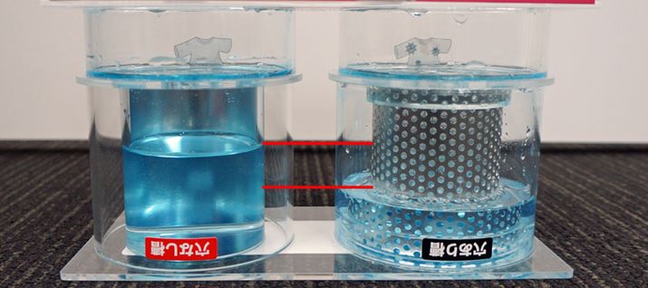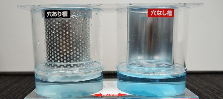 穴の有無で節水性能がどれほど変わるのかを、擬似装置で検証してみよう。それぞれで同じ量の給水を行った状況を作りだすため、装置を上下で反転させると……