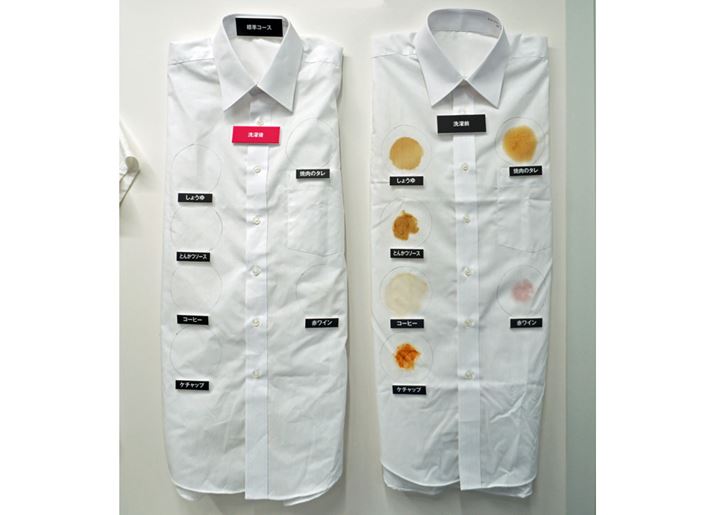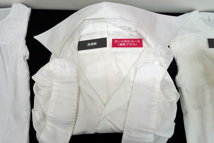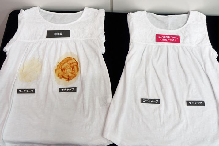 衣類や洗剤液が温まることで、洗剤の酵素が活性化。洗剤のチカラを最大限に発揮するコースとなる。展示されていた汚れ落ちの検証では、色素が残りやすいケチャップも真っ白に!