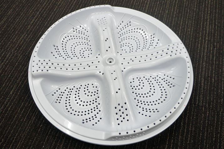 イルカの尾びれを模倣したパルセーターで生み出される水流は、上下に衣類を入れ替えて洗うことができる。その様子は、下の動画で見てほしい。水面に浮いていたボールが、水中に沈んだり上のほうに動いたりと大きく攪拌されている。きちんと攪拌できない洗濯機の場合、同じような検証をしてもボールは水面に浮いたままとなってしまう。槽の回転にあわせて回るだけでは、高い洗浄力は望めない。