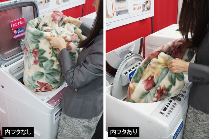 毛布を洗う場合は専用ネットに入れて行うが、出し入れのしやすさを検証するためにあえてネットはなしで試してみた。内フタがあると、投入口に毛布が引っかかり出すのも入れるのも一苦労。実際に洗濯すると取り出し時は濡れて重量が増す。投入口が広く、取り出しやすいことは非常に重要だ