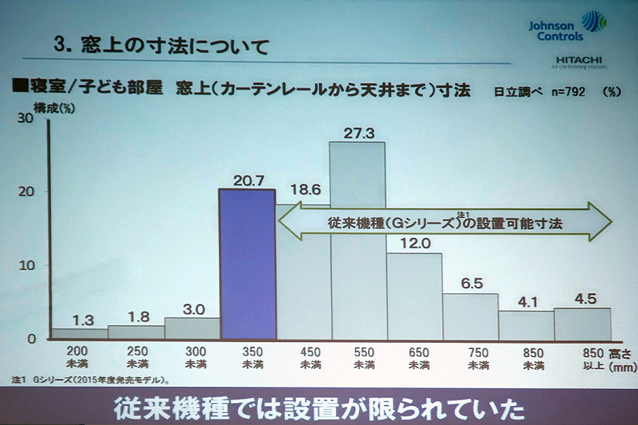 日立の調査によると、寝室や子供部屋の窓上の高さで、一番多かったのが高さ45〜55cm未満のサイズ。次に多かったのは高さ30〜35cm未満であった。Wシリーズは、従来までのGシリーズが設置できなかった、この30〜35cm未満のスペースにも設置できるようになったという。