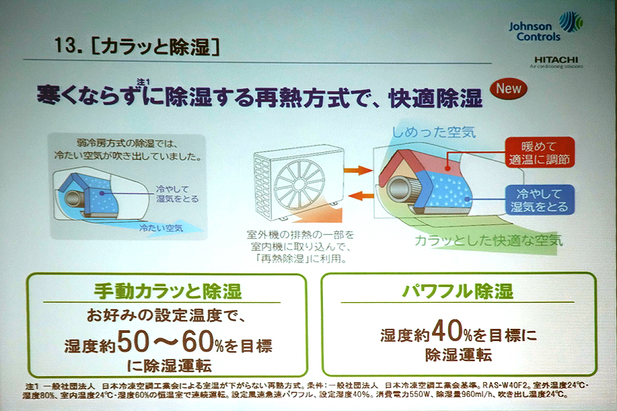 「再熱方式」は室外機の廃熱を利用し、一度冷やした空気を加熱する高度な機能。不快な「冷え」がないほか、非常にパワフルだという