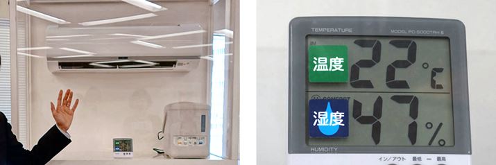 会場では、加湿器で高湿度にした箱でWシリーズを可動させる実験も行われた。90%あった湿度が50%以下に下がったが、温度は23℃から22℃に下がっただけだった