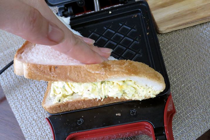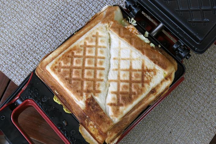 2種の味を同時に焼き上げる「ツインズサンド」の完成! ちなみに、四角に折って長方形にしてもOK