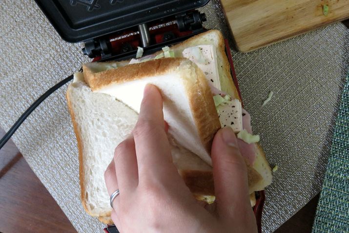 プレートのコーナーに食パンの角を合わせて折り畳む。もう1つも反対側のコーナーで同じように折り畳んでセットし、はみ出さないように工夫しながらフタを閉めて焼く