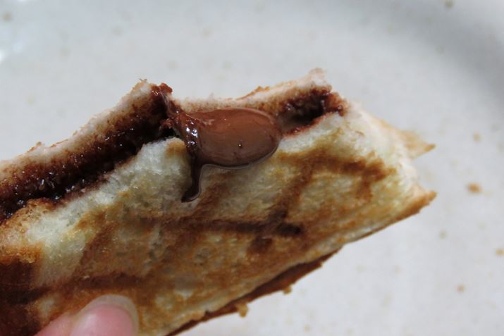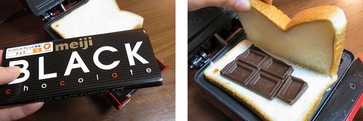 板チョコを挟んでみた。カロリー的には恐ろしいが(笑)、ものすごく美味しい! しかも耳がプレスされてるから、トロトロチョコがこぼれ落ちず食べやすい