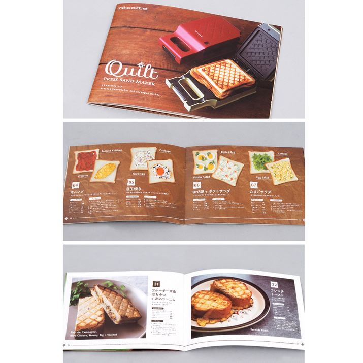 付属のレシピブックにはホットサンドメニューのほかにも、ソーセージや野菜をそのままプレスしたり、フレンチトーストなどのスイーツメニューなど、全33種類のアイデアレシピが掲載されている