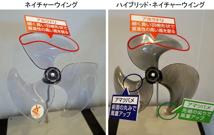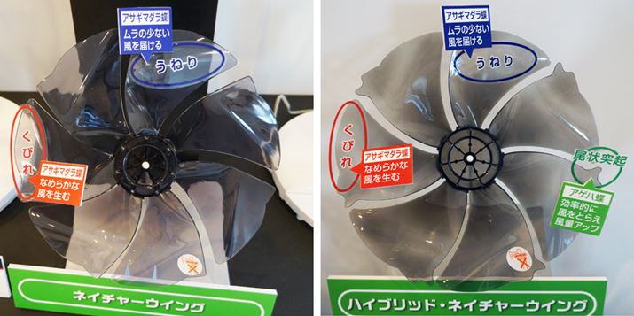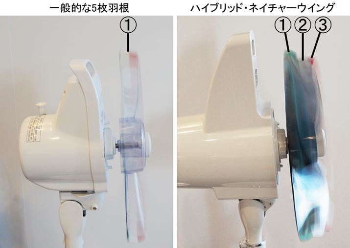視認しやすいように羽根の先端にテープを貼って回転させると、一般的な5枚羽根とハイブリッド・ネイチャーウイングには3重の軌跡が見える。ハイブリッド・ネイチャーウイングは7枚羽根であるが、7×3(くびれ2、突起1)により21枚羽根相当の送風ができるという