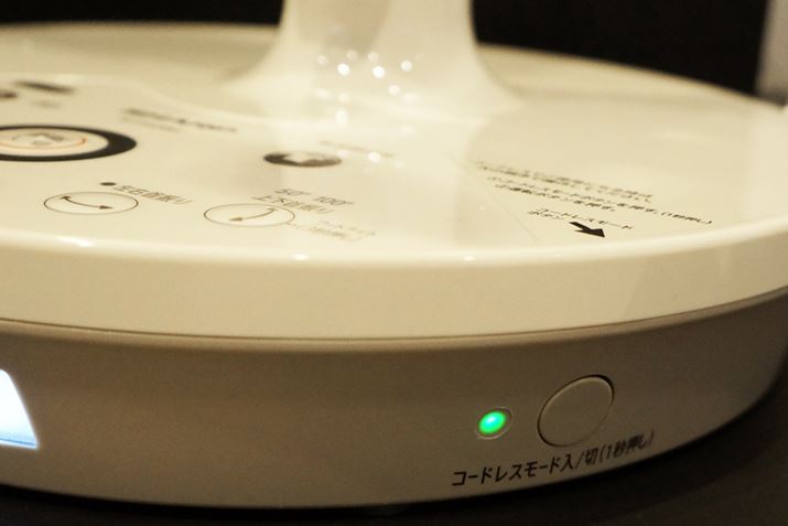 PJ-F2DBGは羽根が異なるたけでなく、コードレスでも使える仕様となっている。充電時間約6時間で、最大約14時間運転可能。また、リビングファンの上位モデル同様に「みはり機能」も搭載されている