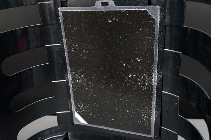 小窓から引き込まれた蚊は、背面パネルに備えられた粘着シートにくっつく。本体に入ってしまったが最後、中には気流と粘着シートがあるので蚊は逃げられない