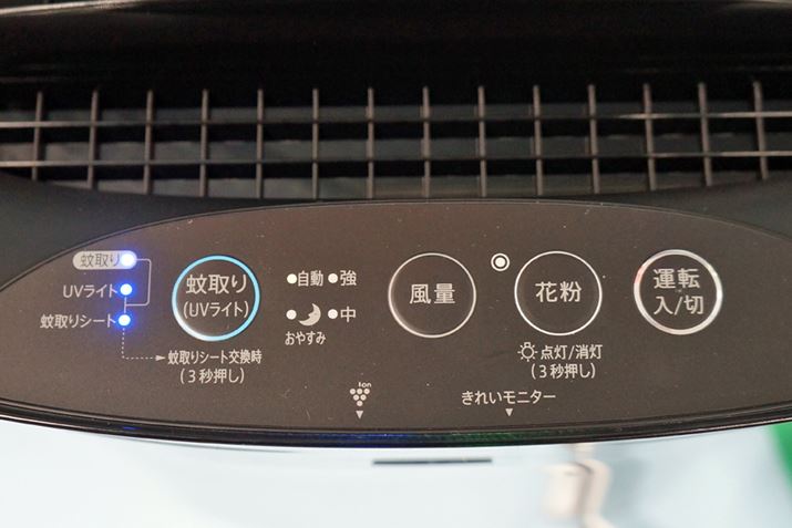 就寝時に蚊取空清の「蚊取りモード」を利用したい時には、「おやすみ運転」を選ぶと風量が抑えられ、静かな運転へと切り替わる。前面モニターのライトが消灯し、UVランプの照度も落ちるので睡眠の妨げにもならない。その間も、もちろん蚊の捕獲は行われるので快適だ