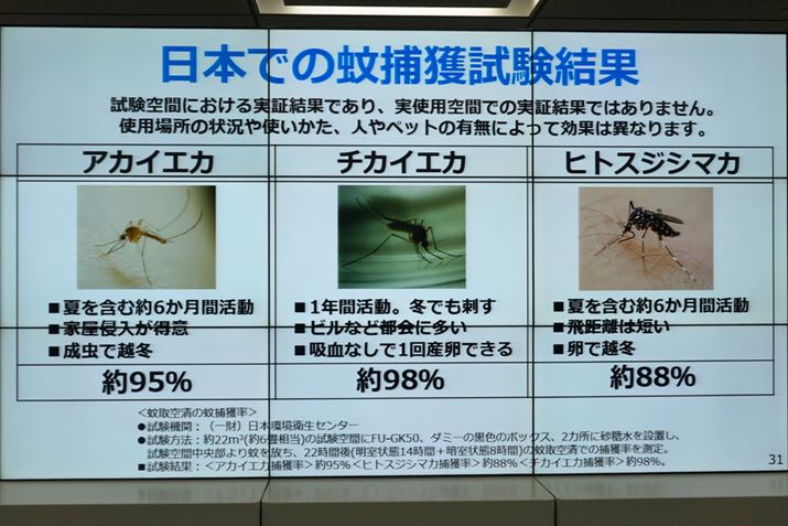 日本に多い3種類の蚊をどれだけ取れるのかを試験した結果、チカイエカは約98%の捕獲率となった。日本では検証されていないが、ASEANで行われたテストでは小バエの捕獲も上々だったという