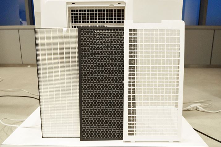 背面から吸い込まれた空気は、大きなホコリをブロックするプレフィルター→0.3μmの粒子も99.97%キャッチする静電HEPAフィルター→タバコ臭や料理臭などを除去する脱臭フィルターでろ過されるので、洗濯物に当たる風もキレイ!