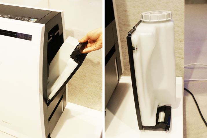 加湿するための水と除湿した水を溜めるタンクは、それぞれ用意されている。加湿用の給水タンクの容量は約3Lで、自立する仕様
