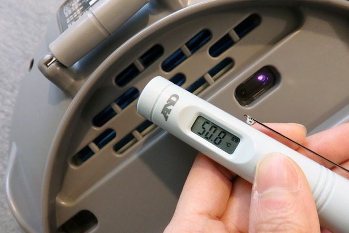 EC-HX150には室温などにあわせてパワーを自動で調整してくれる「自動モード」のほか、自動モードの2倍の吸引力で掃除する「フルパワーモード」、ブラシの回転数や吸引力が弱めになる「デリケートモード」といった3つの運転モードが用意されている。放出される温風の温度も、モードにより異なるようだ。どの程度の違いがあるのかをチェックしてみよう。