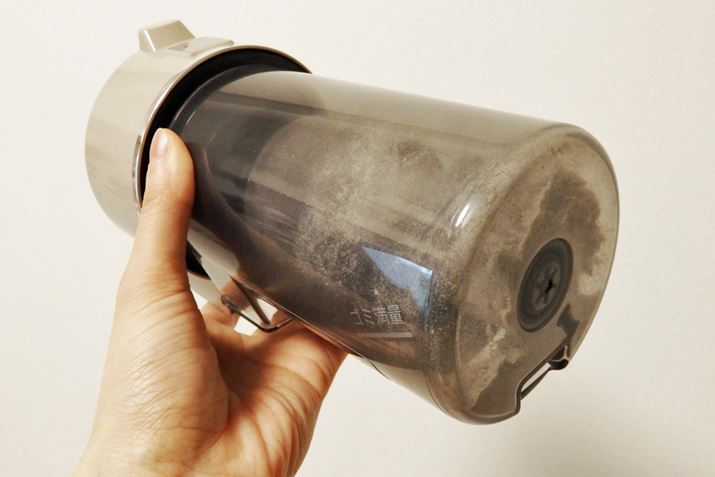 掛け布団と敷布団を裏表掃除すると、たった1回でたっぷりゴミが取れた。カップ内には高速で旋回する気流が発生しているためか、砂塵のような細かいゴミがたっぷり!