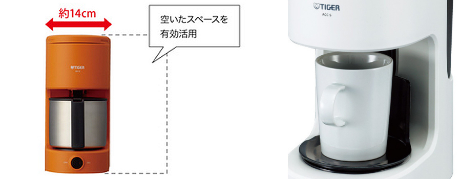 付属の専用カップトレイを使うことで、サーバーだけでなくマグカップに直接コーヒーをドリップすることができるコーヒーメーカー。1杯から淹れることができるので、余らせることもないし、洗い物が増えないのもうれしい。また、幅約14cmというスリムさがひとり暮らしのキッチンにはありがたいところ。操作部やフィルター、水タンクの着脱も前面から可能なので、ちょっとした隙間に設置することができる。6杯分ドリップできるテンレス製のサーバーも付属するので、友達が来た際もOK! なお、ドリップは、コクと香りを引き立たせるため、コーヒー粉の上にシャワー状にお湯を注ぐ「シャワードリップ方式」が採用されている。