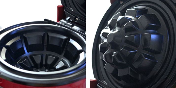 下(凹)プレートに生地を流し入れフタを閉じれば2〜3分で焼きあがる。生地の量や調味量を調整することでサイズを変えたり、おかず用のワッフルボウルにも対応。サイズは約20(幅)×22(奥行き)×14(高さ)cm、重量は約1.45kg