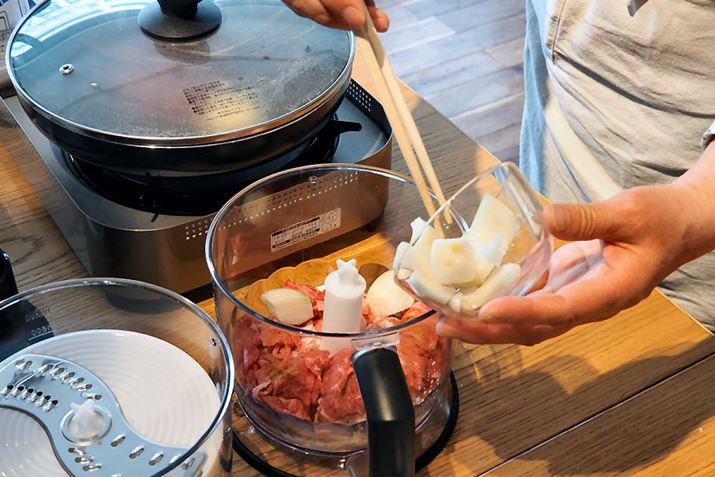 そして、ハンバーグに使う肉は「牛肉のコマ」と「豚バラ肉」。フードプロセッサーを使用するのでミンチ肉を購入する必要がありません。薄切りやブロック肉でも利用できるので、冷蔵庫や冷凍庫で余っている肉でハンバーグが作れます。ミンチ肉はカサ増しのために脂身が多いものもありますが、MQ775ならば、ダイエット中は低脂肪な牛モモだけ……という選択もできますね。