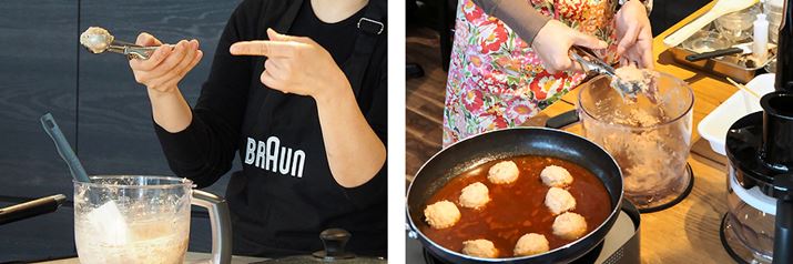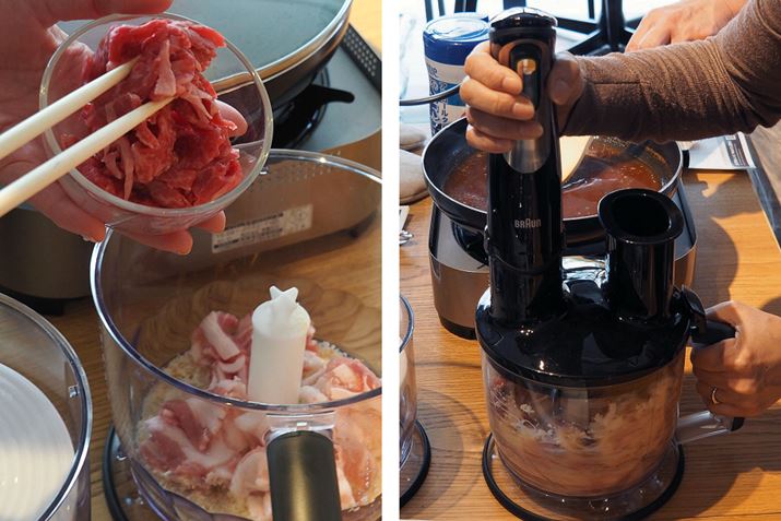 まず最初に作るのは、「一口煮込みハンバーグ」。この料理にはMQ775の「フードプロセッサー」アタッチメントを使用します。作り方は簡単で、材料と焼いたベーコンを入れてMQ775で混ぜ、フライパンに入れたソースの材料と煮込む”だけ。本当にこれ以上説明することがないんです(笑)。